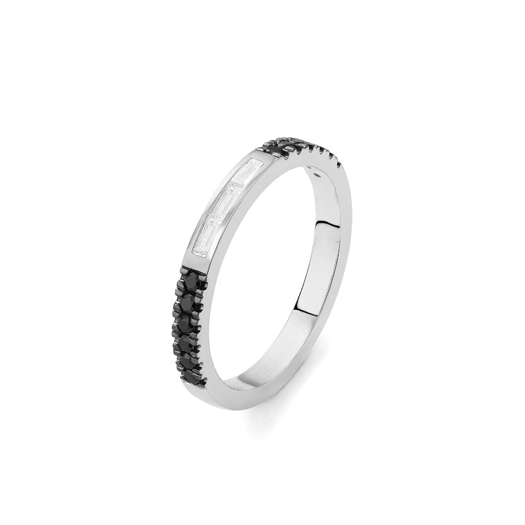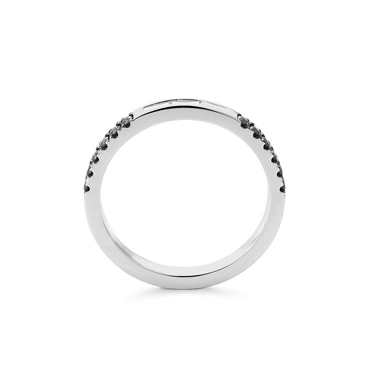 Media alianza fabricada en oro de 18 kilates o platino a tu elección, con diamantes negros en talla brillante y diamantes en talla baguette en la parte central.