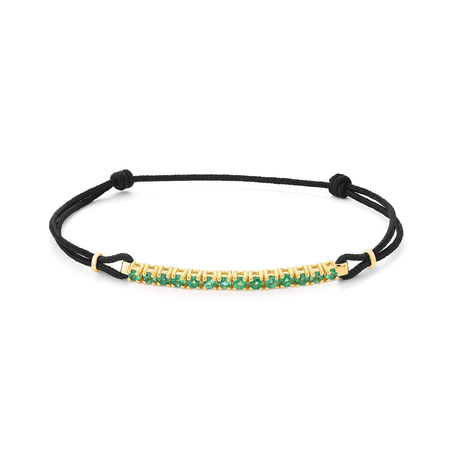 Pulsera hilo nylon con sección riviere en oro amarillo 18 Kilates y esmeraldas