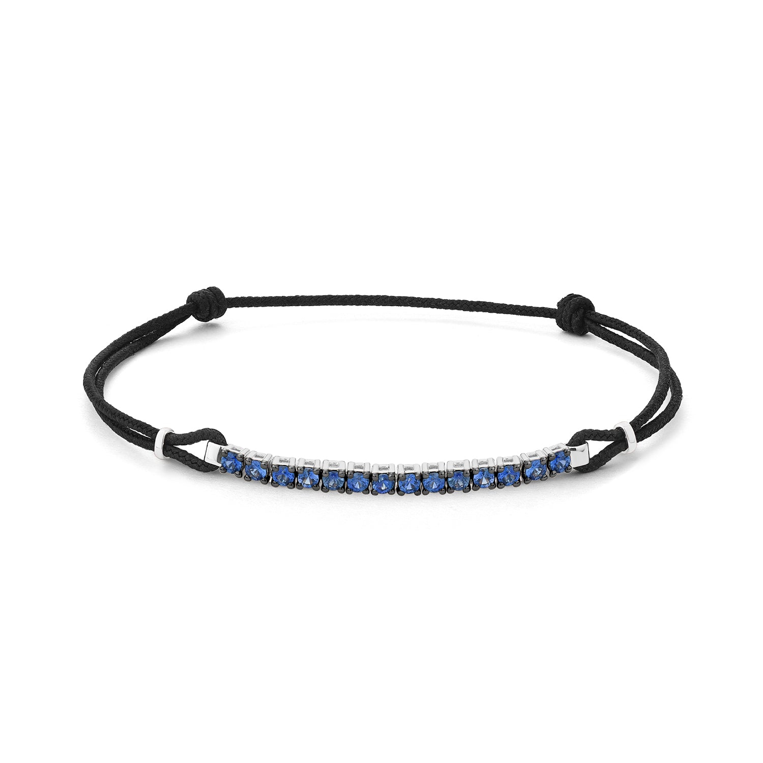 Pulsera hilo nylon con sección riviere en oro blanco 18 Kilates y zafiros azules.
