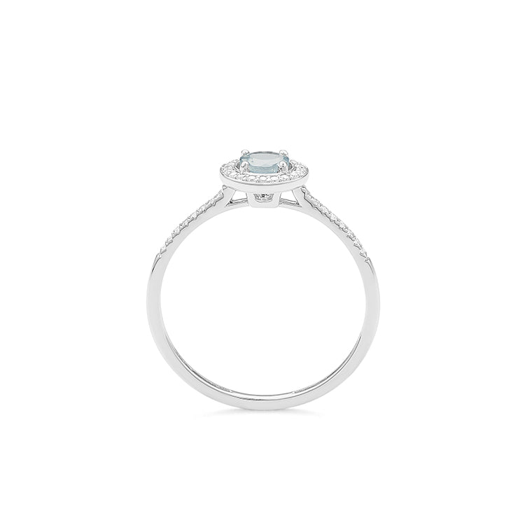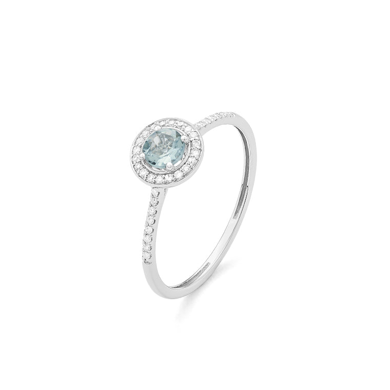Solitario acompañado fabricado en oro de 18 Kilates o Platino a tu elección, con centro de aguamarina y orla y acompañamiento de diamantes.