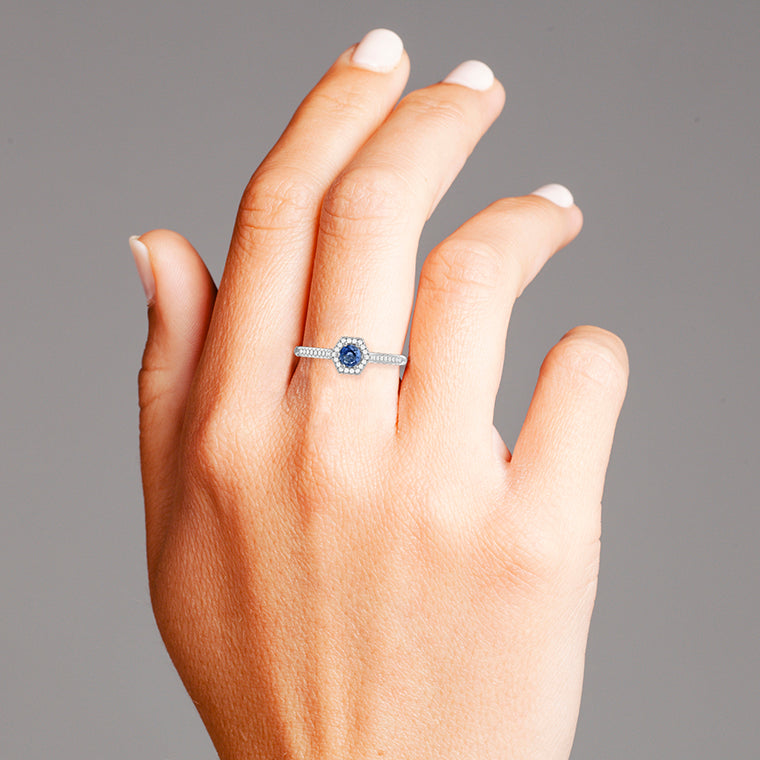 Anillo fabricado en oro de 18 kilates o platino a tu elección. Centro de Zafiro azul, y orla hexagonal de diamantes con acompañamiento de diamantes en el brazo del anillo.