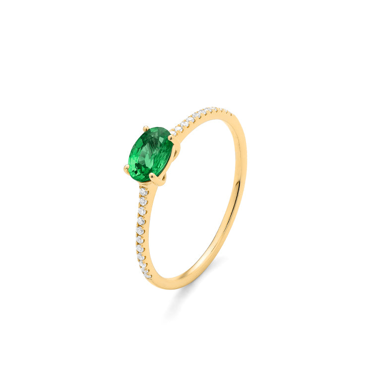 Anillo fabricado en oro de 18 kilates con centro de piedra preciosa a elegir, y diamantes.