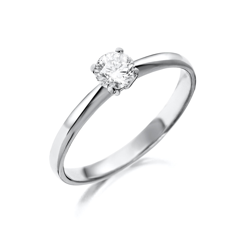 Solitario fabricado en oro blanco de 18 quilates. Consta de un diamante talla brillante engastado en 4 garras. El anillo perfecto para una pedida de mano.